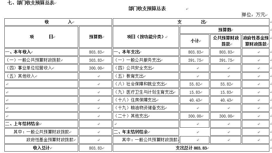收入預(yù)算包括:財(cái)政撥款收入 503.83 萬元,占 62.67 %;事業(yè)收入 0萬元,占 0 %;事業(yè)單位經(jīng)營收入 300 萬元,占 37.32 %;其他收入 0萬元,占 0 %。