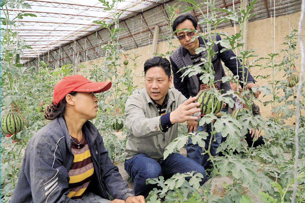 第九批援寧掛職干部戴文利(中)在彭陽縣大力發(fā)展設(shè)施農(nóng)業(yè),圖為指導(dǎo)溫棚吊瓜管理。 徐樹雄 攝