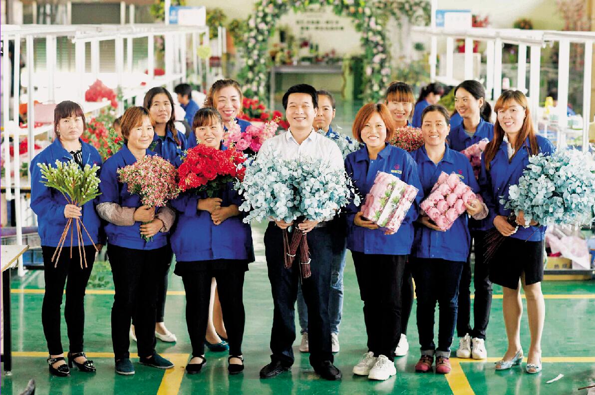 閩商潘文賢(左四)在固原市隆德縣隆德人造花工藝有限公司與企業(yè)員工合影? ?新華社記者 王鵬 攝
