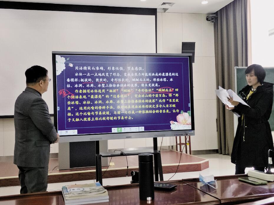 小任老師工作10年了,充滿朝氣和活力,嗓音清亮,普通話標準。她站立在屏幕一側(cè),拿著文字講稿和簽字筆,對著屏幕上的課件講述;安奇老師站在另一側(cè),隨時上前用手或筆在屏幕上圈圈點點指出需要修改完善之處,一邊還用手機錄音和計時;王敏老師坐在臺下盯著電腦上的課件,根據(jù)大家的意見對原稿進行修改。那真是逐字逐句斟酌推敲啊!