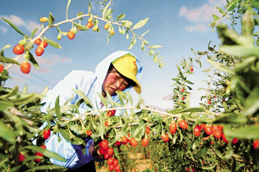 賀蘭縣南梁臺子農(nóng)牧場鐵西村枸杞合作社女工正在采摘枸杞