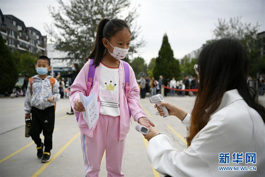 9月1日,銀川市興慶區(qū)回民第二小學(xué)一年級新生接受入校體溫檢測。當(dāng)日,寧夏銀川市各中小學(xué)、幼兒園正式迎來新學(xué)期。 新華社記者 王鵬 攝