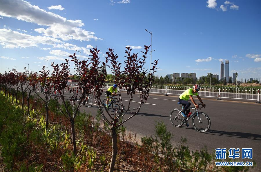 在寧夏銀川,顧大我(右一)與鐵人三項(xiàng)俱樂(lè)部的隊(duì)友們進(jìn)行騎行訓(xùn)練(7月26日攝)。 新華社記者 賈浩成 攝