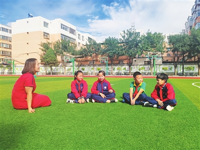 下午課間休息時(shí),大隊(duì)輔導(dǎo)員吳彥儒和4名同學(xué)接受記者采訪。
