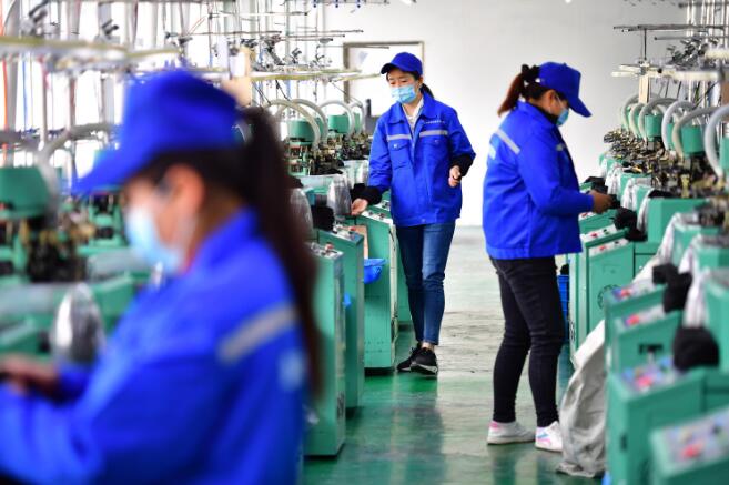 平利縣老縣鎮(zhèn)錦屏社區(qū)的社區(qū)工廠,工人在加工襪子