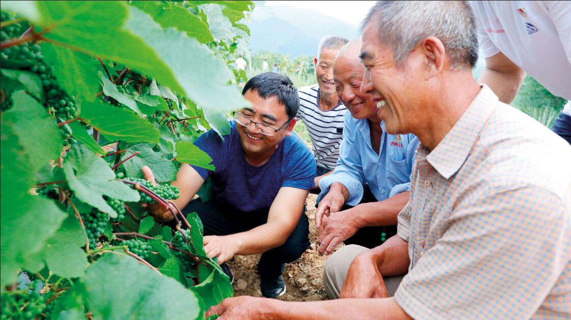 駐村第一書記劉葉陽(左)和村民查看山葡萄長勢? ?李志濤/攝