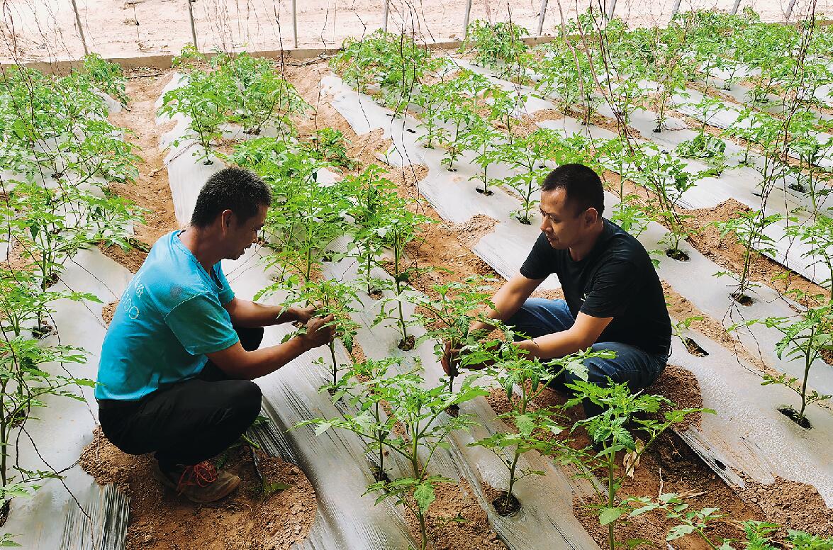 趙忠宏(右)在村民田席平家的大棚里了解西紅柿種植及長勢情況