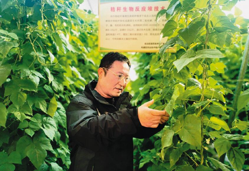 馬學(xué)鋒查看秸稈生物反應(yīng)堆技術(shù)應(yīng)用情況及豆角長(zhǎng)勢(shì)