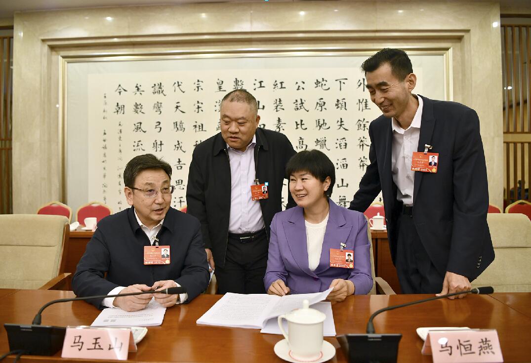 全國人大代表馬玉山、潘峰、馬恒燕、王東新(從左至右)熱議政府工作報告? ??左鳴遠/攝?