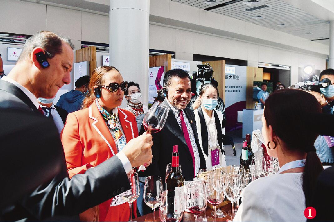 外國(guó)嘉賓正在品嘗賀蘭山東麓產(chǎn)區(qū)的葡萄酒。
