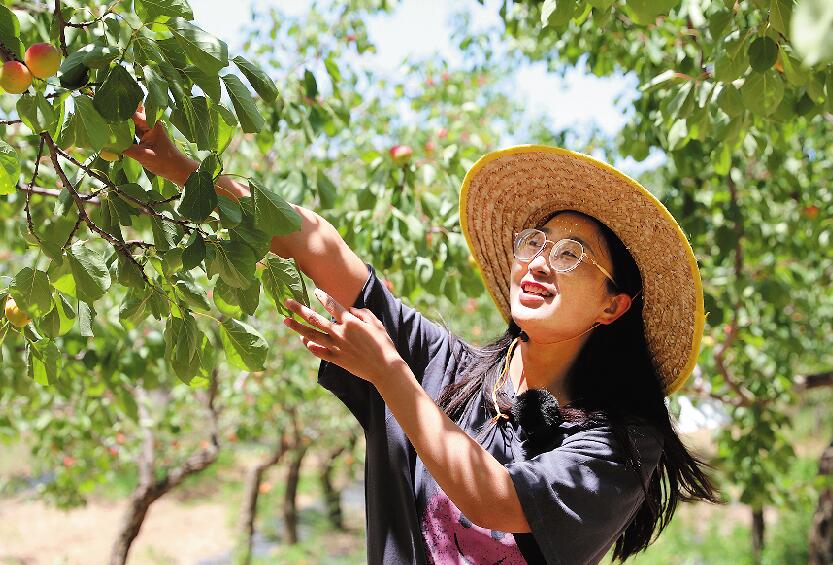 游客采摘紅梅杏。