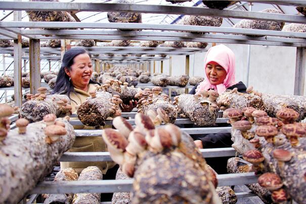 種植戶(hù)在隆惠村香菇種植基地摘取蘑菇。