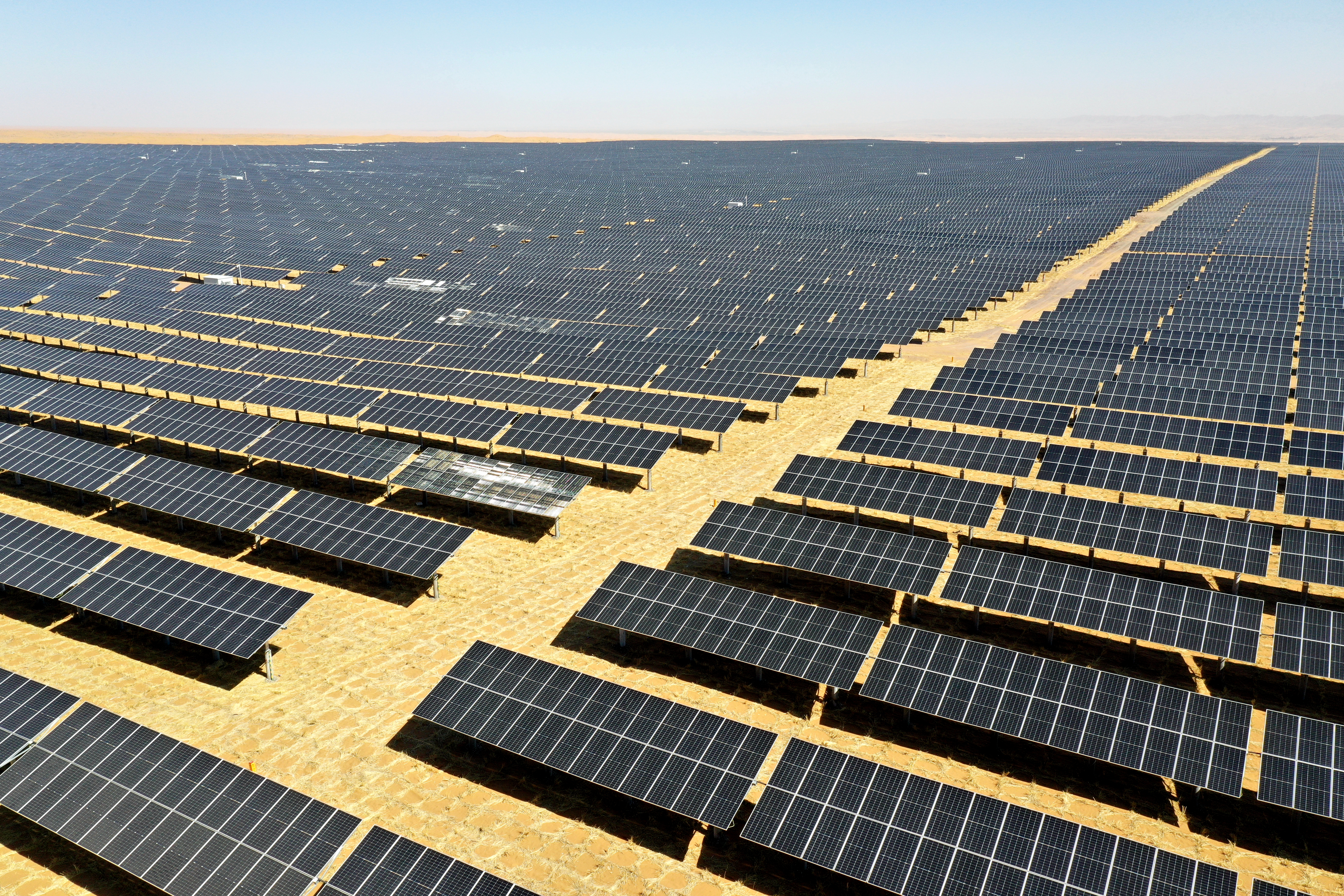 從中衛(wèi)市區(qū)驅(qū)車向西北方向行駛20多公里,進(jìn)入騰格里沙漠,只見連綿起伏的金沙上鋪了一層碧波海洋,在陽光的照耀下銀光閃閃。這是寧夏騰格里沙漠新能源基地項目,是國家千萬千瓦級“沙戈荒”基地中首個備案、開工、投產(chǎn)的基地項目,也是我國第一條以開發(fā)沙漠光伏大基地、輸送新能源電量為主的特高壓輸電通道——“寧電入湘”工程的重點配套項目。