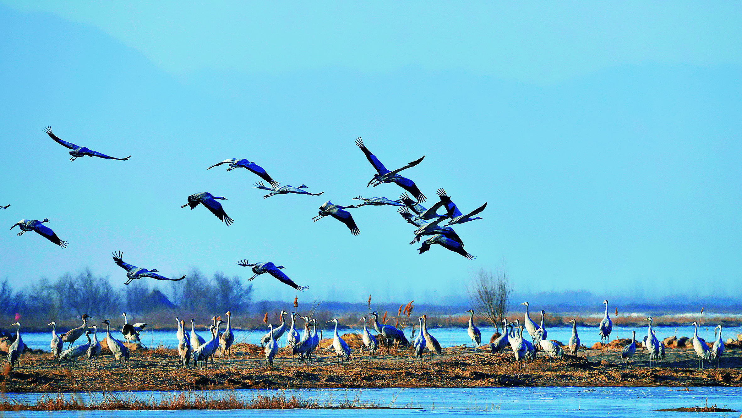 黃河水質(zhì)和生態(tài)環(huán)境的不斷改善,引得灰鶴家族不斷壯大。圖為銀河灣濕地公園鳥兒戲水。