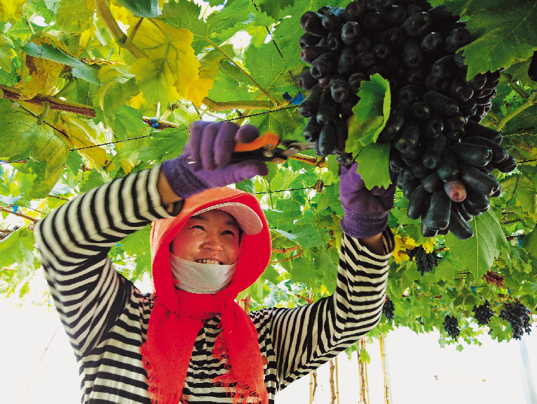 寧夏銀湖農(nóng)林牧開發(fā)有限公司產(chǎn)業(yè)工人唐秀紅正在采摘葡萄。? 張筱/攝