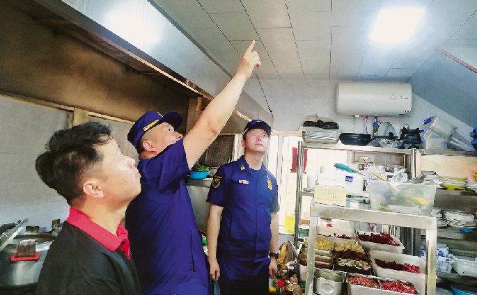 吳忠市消防救援支隊(duì)在餐廳后廚檢查消防報警器。