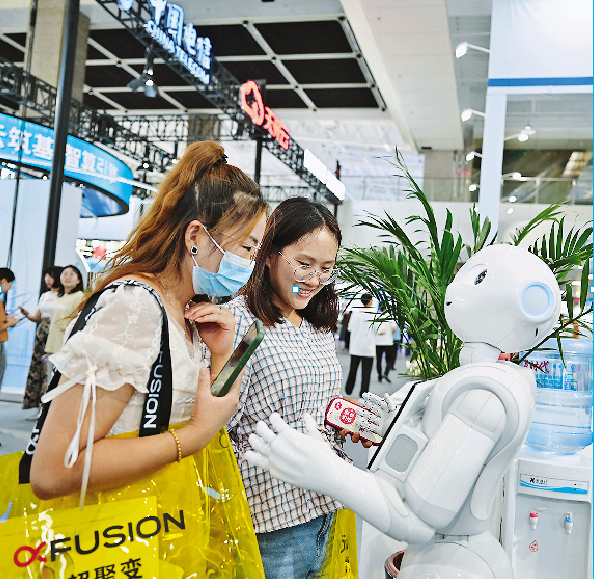 觀展者與展區(qū)中的智能機(jī)器人互動(dòng)。
