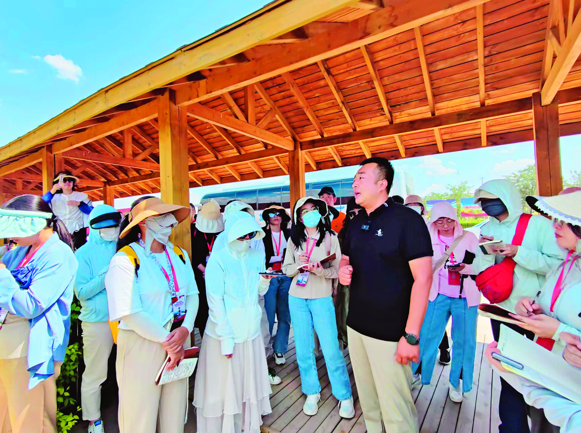 “一汪碧水從天降,瀚海沙漠起平湖。葦湖泛舟,翩翩鷗鷺掠水飛。枕沙傍水,串串腳印笑語盈。早觀蘆蕩日出,晚聽駝鈴叮當?!边@是沙湖自然保護區(qū)的美景和游客體驗的生動寫照。在沙湖自然保護區(qū),采訪團近距離感受了沙湖的雄渾與秀美。