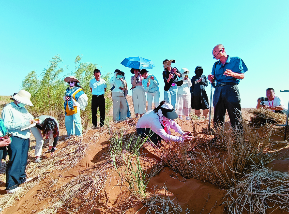 全國(guó)黨刊全媒體記者在中衛(wèi)市西郊林場(chǎng)采訪治沙人唐希明(右一)。