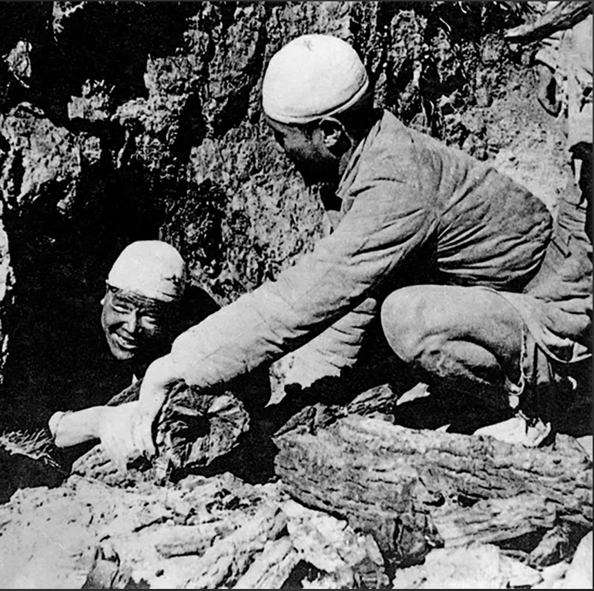 張思德(左)和戰(zhàn)友一起燒炭。這是他生前留下的唯一一張照片。 資料圖片