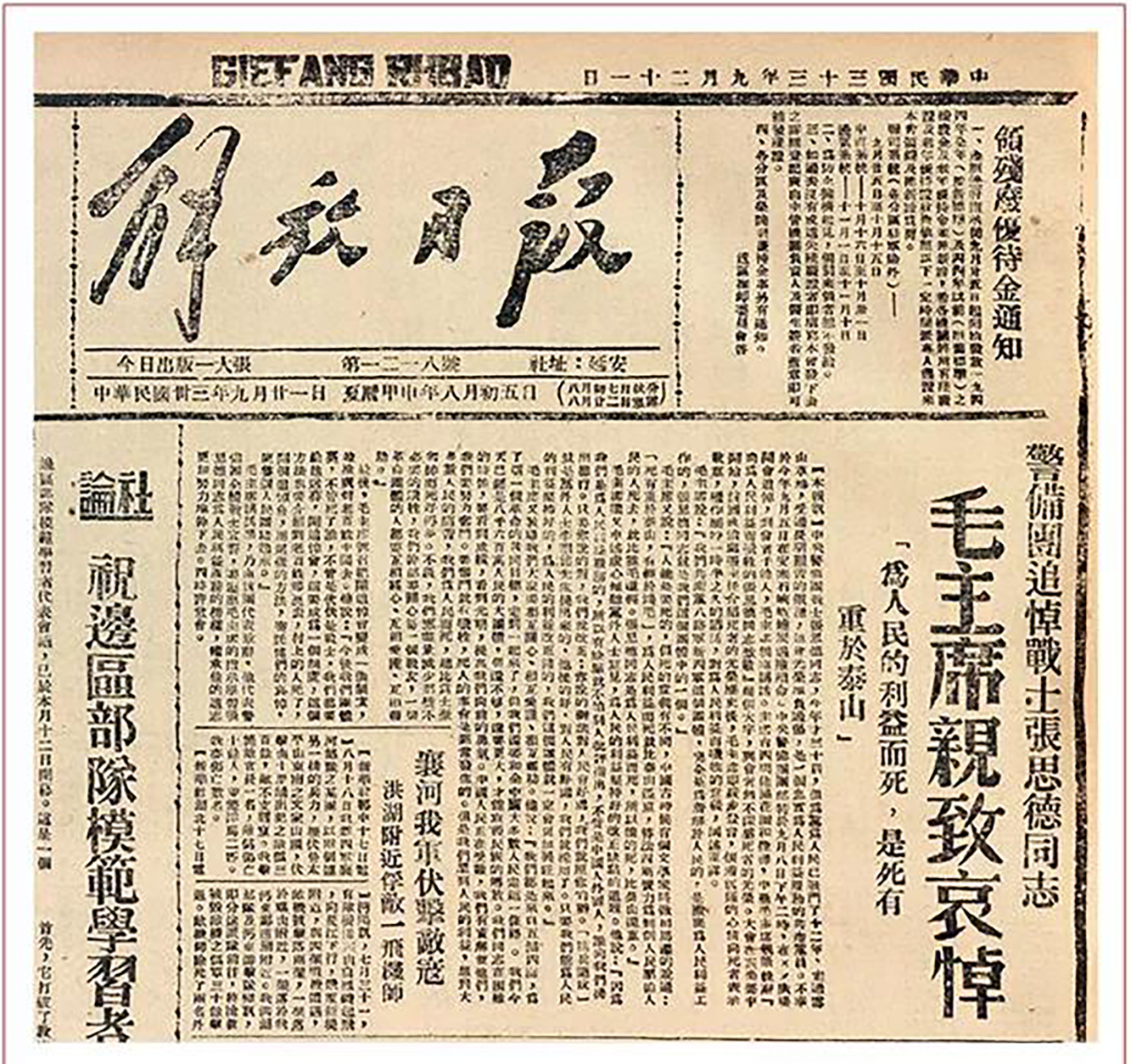 1944年9月8日,毛澤東在張思德追悼會(huì)上發(fā)表講演,高度贊揚(yáng)他完全、徹底為人民服務(wù)的崇高思想境界和革命精神。這篇講演,既是一篇悼念革命戰(zhàn)士的沉痛悼詞,更是一篇為人民服務(wù)的光輝宣言。圖為《解放日?qǐng)?bào)》(1944年9月21日第1版)關(guān)于這次追悼會(huì)的報(bào)道?!≈醒朦h史和文獻(xiàn)研究院供圖