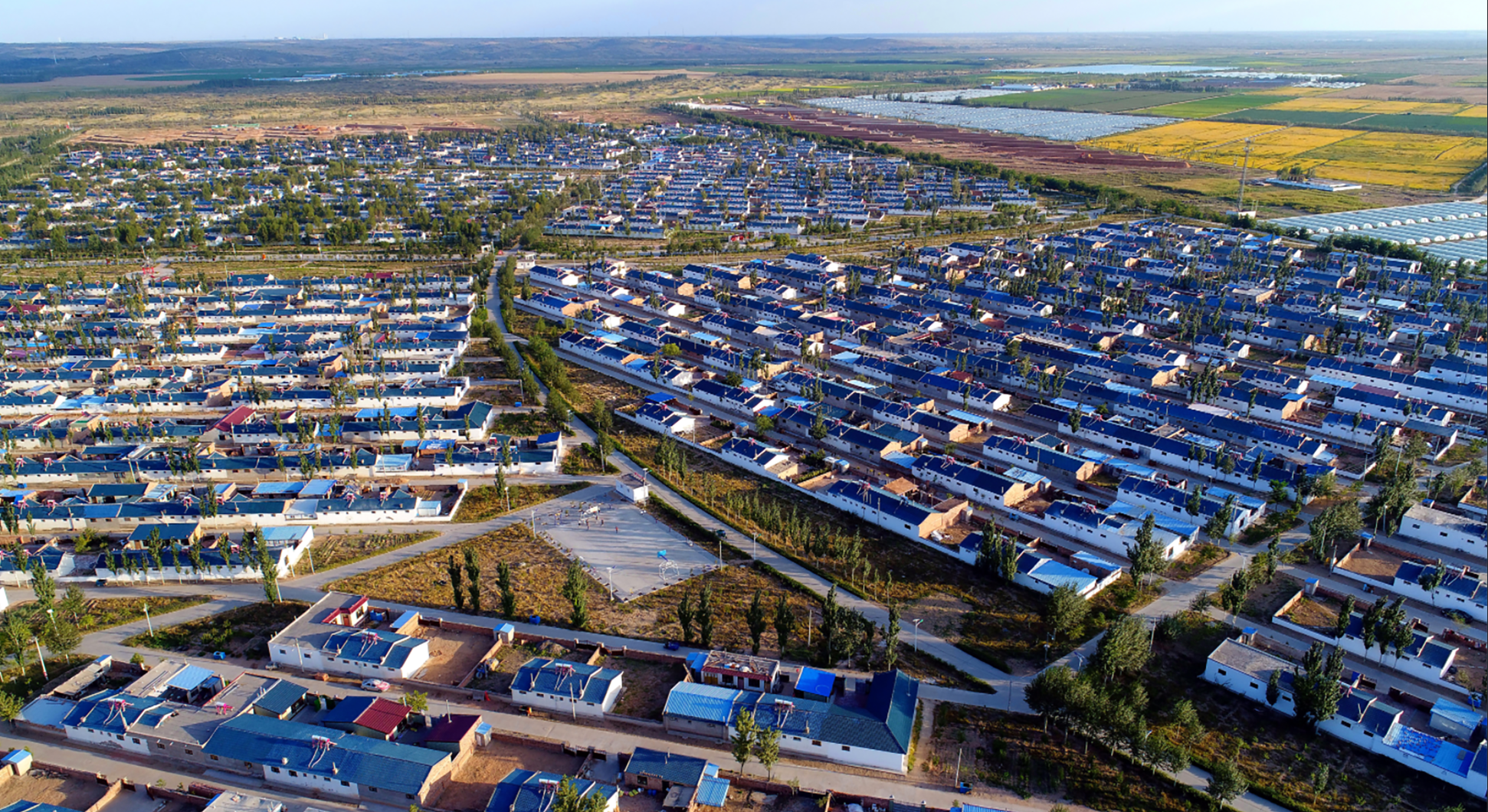 平羅縣陶樂鎮(zhèn)廟廟湖村是自治區(qū)“十二五”時期重點建設(shè)的生態(tài)移民集中安置區(qū),從空中俯瞰,村居鱗次櫛比,大片良田和設(shè)施農(nóng)業(yè)大棚整齊排列。 平羅縣委辦公室供圖