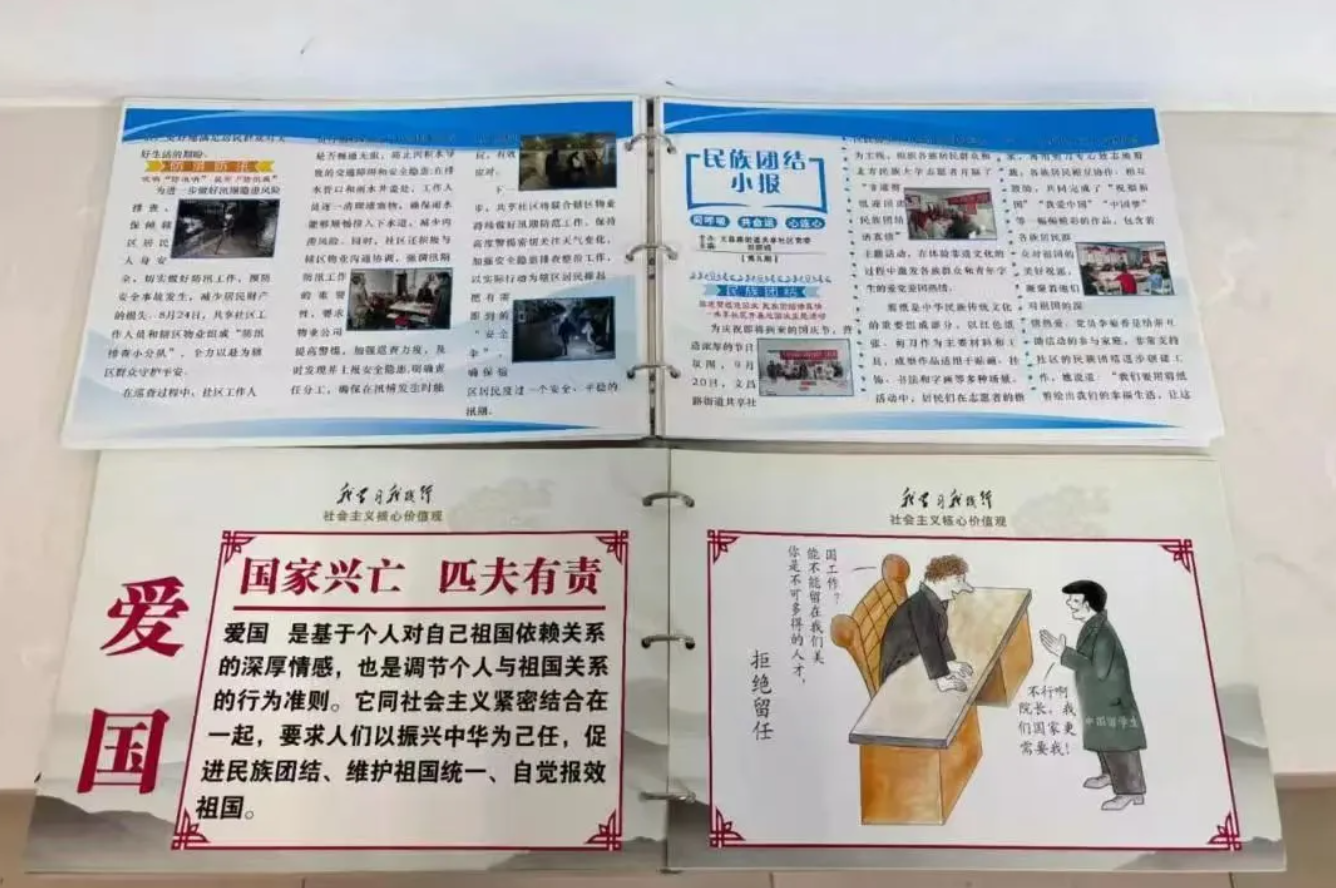 充分發(fā)揮社區(qū)黨委核心作用,整合社區(qū)、廠區(qū)、校區(qū)資源,積極探索“黨建+民族團(tuán)結(jié)進(jìn)步”工作模式,制作《民族團(tuán)結(jié)小報(bào)》《建黨100周年》《社會(huì)主義核心價(jià)值觀》等“圖說”系列畫冊(cè),引導(dǎo)各族群眾手足相親、鄰里守望、團(tuán)結(jié)和睦,不斷增進(jìn)“五個(gè)認(rèn)同”。