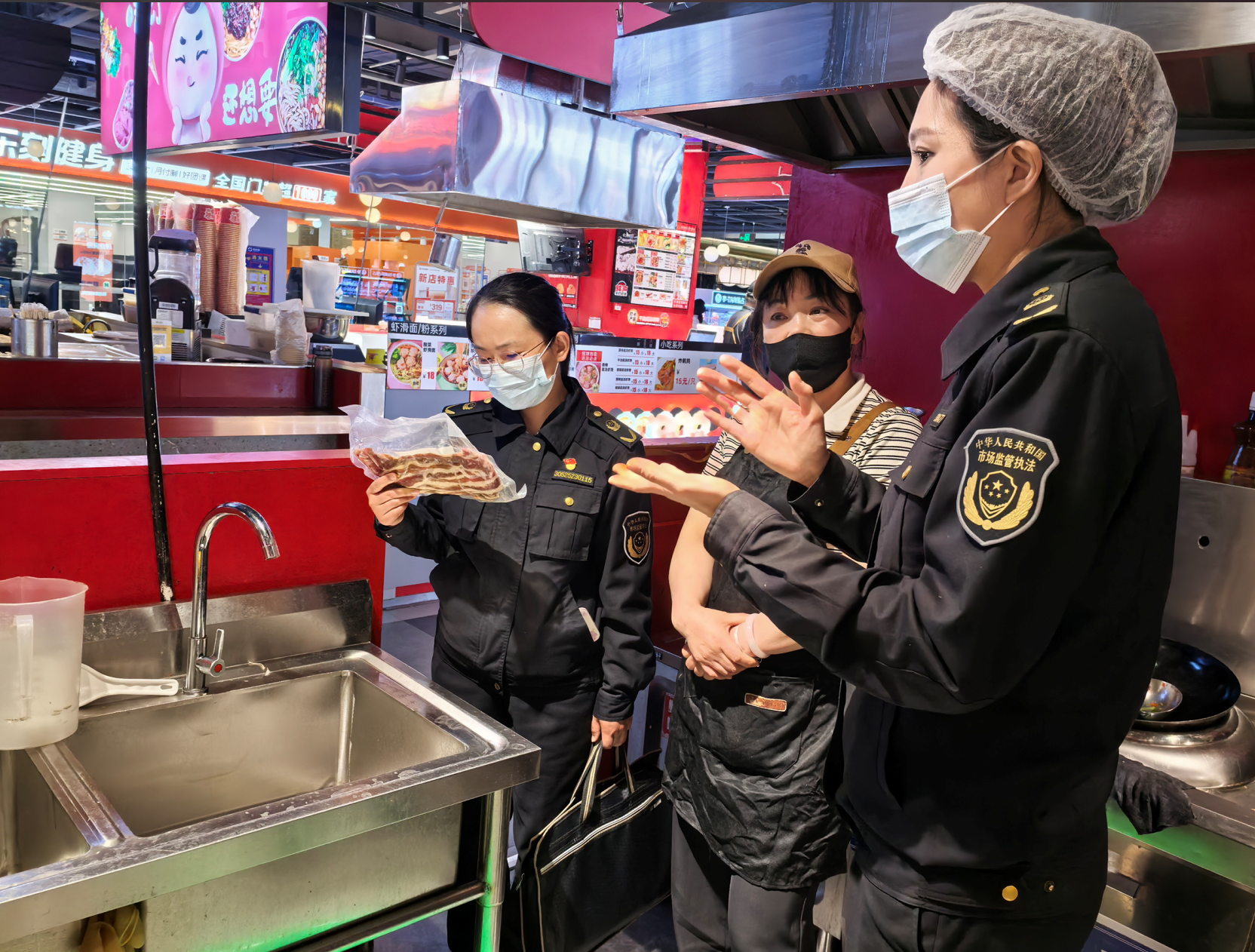 執(zhí)法人員對轄區(qū)內(nèi)餐飲商戶開展食品安全檢查?!∽灾螀^(qū)市場監(jiān)管廳供圖