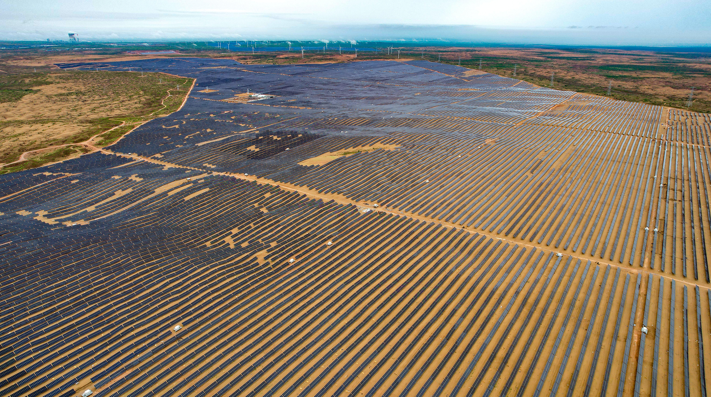 從高空俯瞰寧夏星海新能源有限責(zé)任公司建設(shè)的石嘴山市100萬(wàn)千瓦光伏發(fā)電復(fù)合項(xiàng)目,萬(wàn)千深藍(lán)色光伏板匯成“能源之?!?。 王曉龍/攝