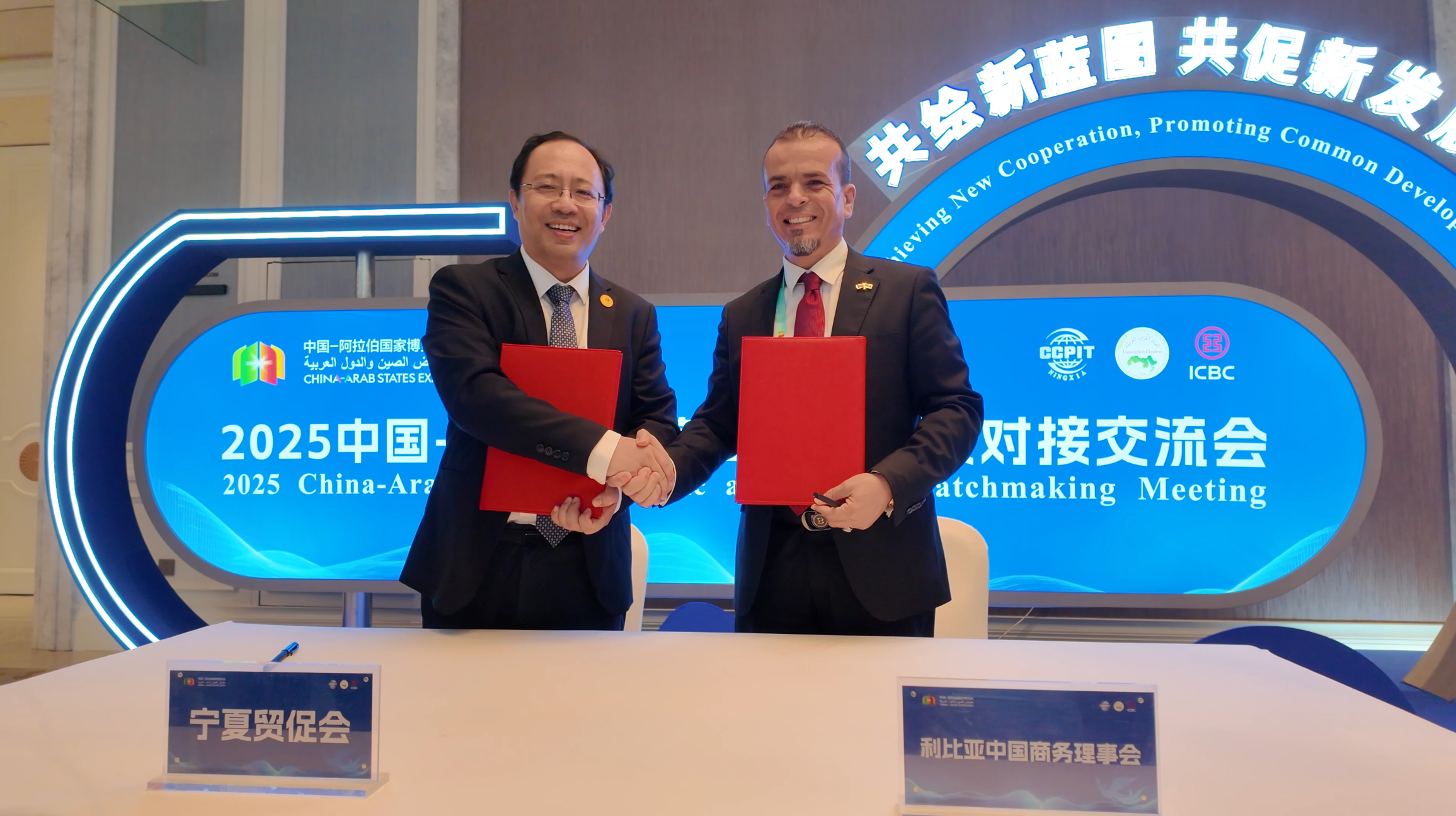 8月28日,在2025中國(guó)—阿拉伯國(guó)家工商界經(jīng)貿(mào)對(duì)接交流會(huì)上,26個(gè)合作項(xiàng)目正式敲定,總金額超120億元。圖為寧夏貿(mào)促會(huì)與利比亞中國(guó)商務(wù)理事會(huì)簽署加強(qiáng)經(jīng)貿(mào)合作諒解備忘錄?!№n春波/攝