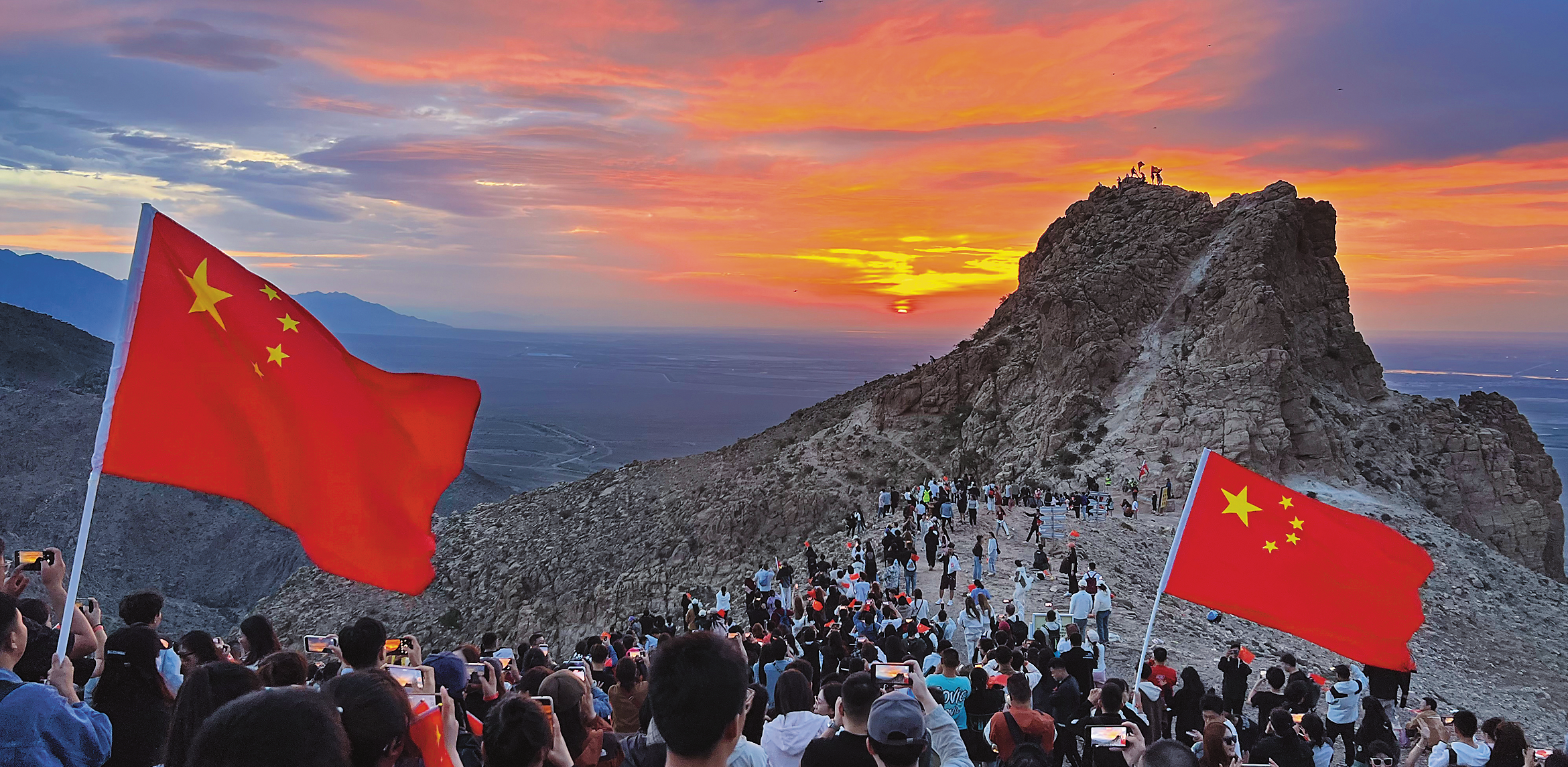 在銀川市滾鐘口風(fēng)景區(qū),游客攀登山巔,在晨光熹微中見證紅日破曉。 銀川市文化旅游廣電局供圖