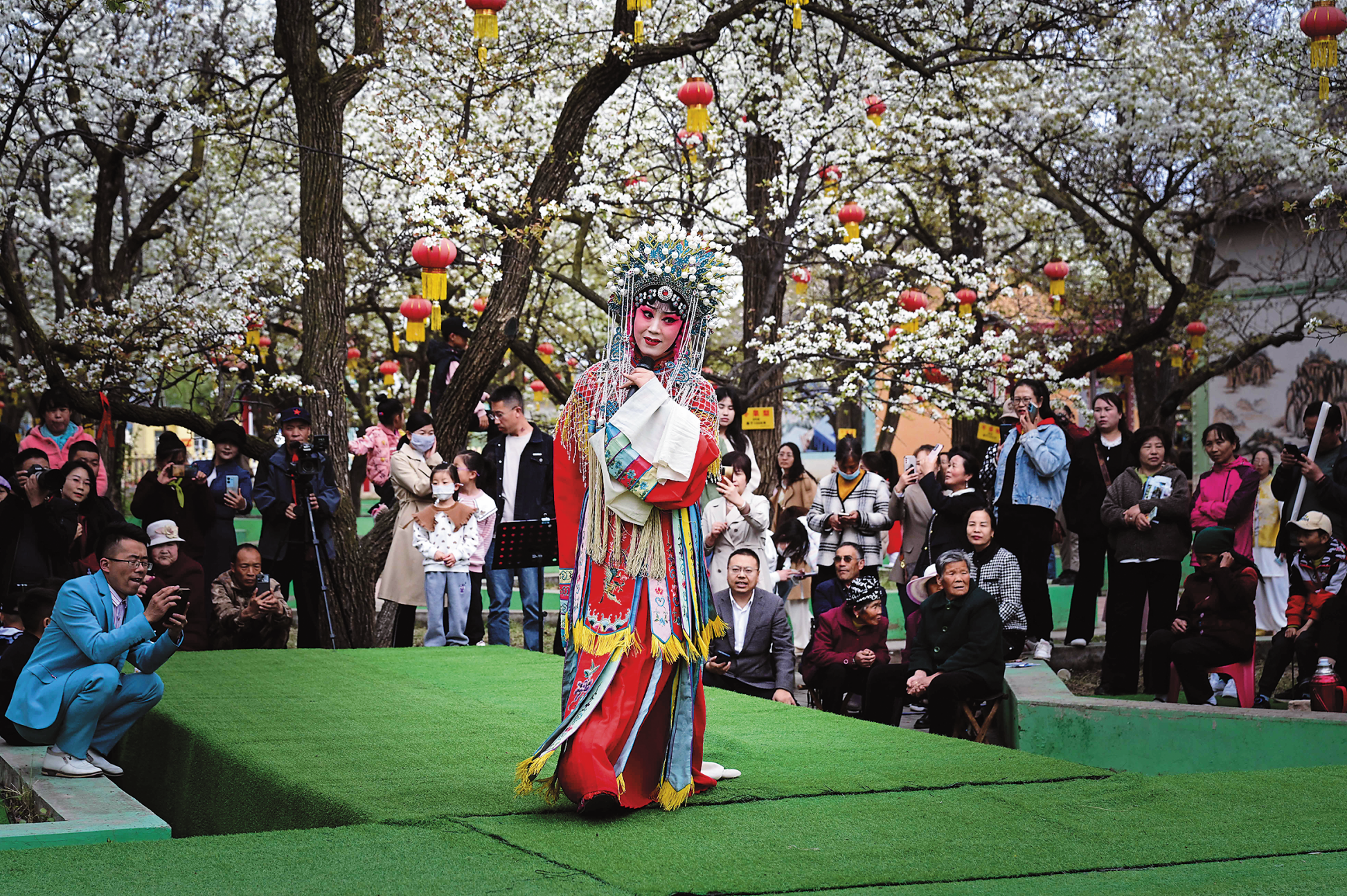 2024年春,隆德縣神林山莊百年梨樹花競相盛開,秦腔藝人登臺獻(xiàn)藝,吸引眾多游客觀賞。 吳瀟/攝