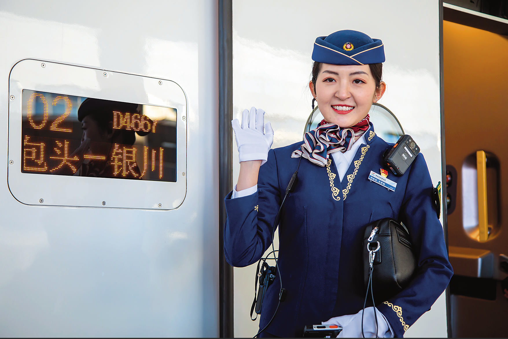 包銀高鐵D4667次(包頭—銀川)首發(fā)列車的乘務(wù)員,正在迎接 首批搭乘這條新線的乘客。 宋佳龍/攝