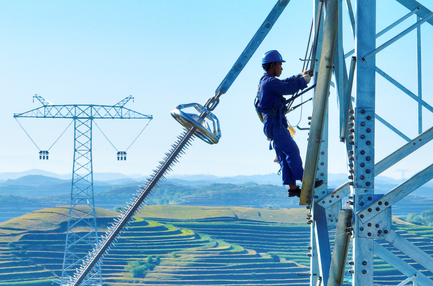 電力工人在西吉縣境內(nèi)的特高壓直流組塔現(xiàn)場(chǎng)進(jìn)行緊固螺栓施工作業(yè)。 袁宏彥/攝