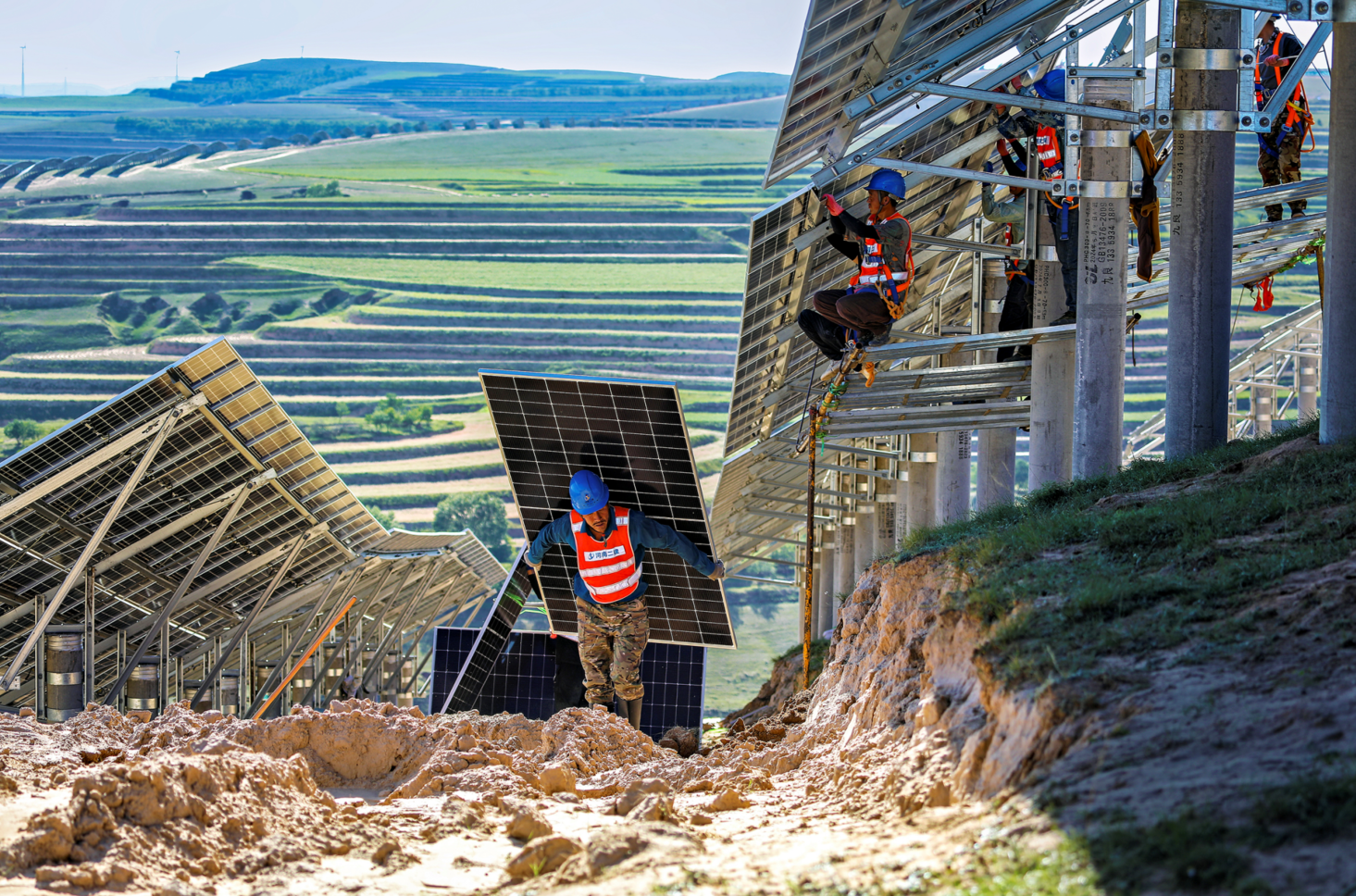 在同心縣張家塬鄉(xiāng)汪家塬村光伏基地建設(shè)現(xiàn)場(chǎng),工人們正忙著搬運(yùn)、安裝光伏組件。 張旭東/攝