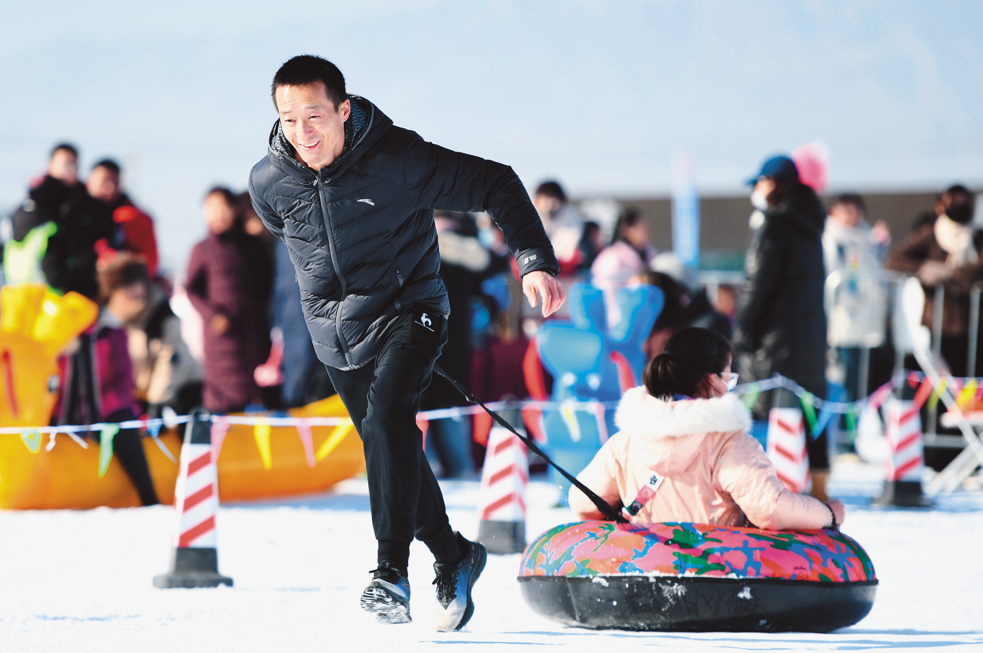 群眾的冬季休閑娛樂生活日益豐富,孩子在家長的陪同下體驗滑雪圈等冰雪活動。 自治區(qū)體育局供圖