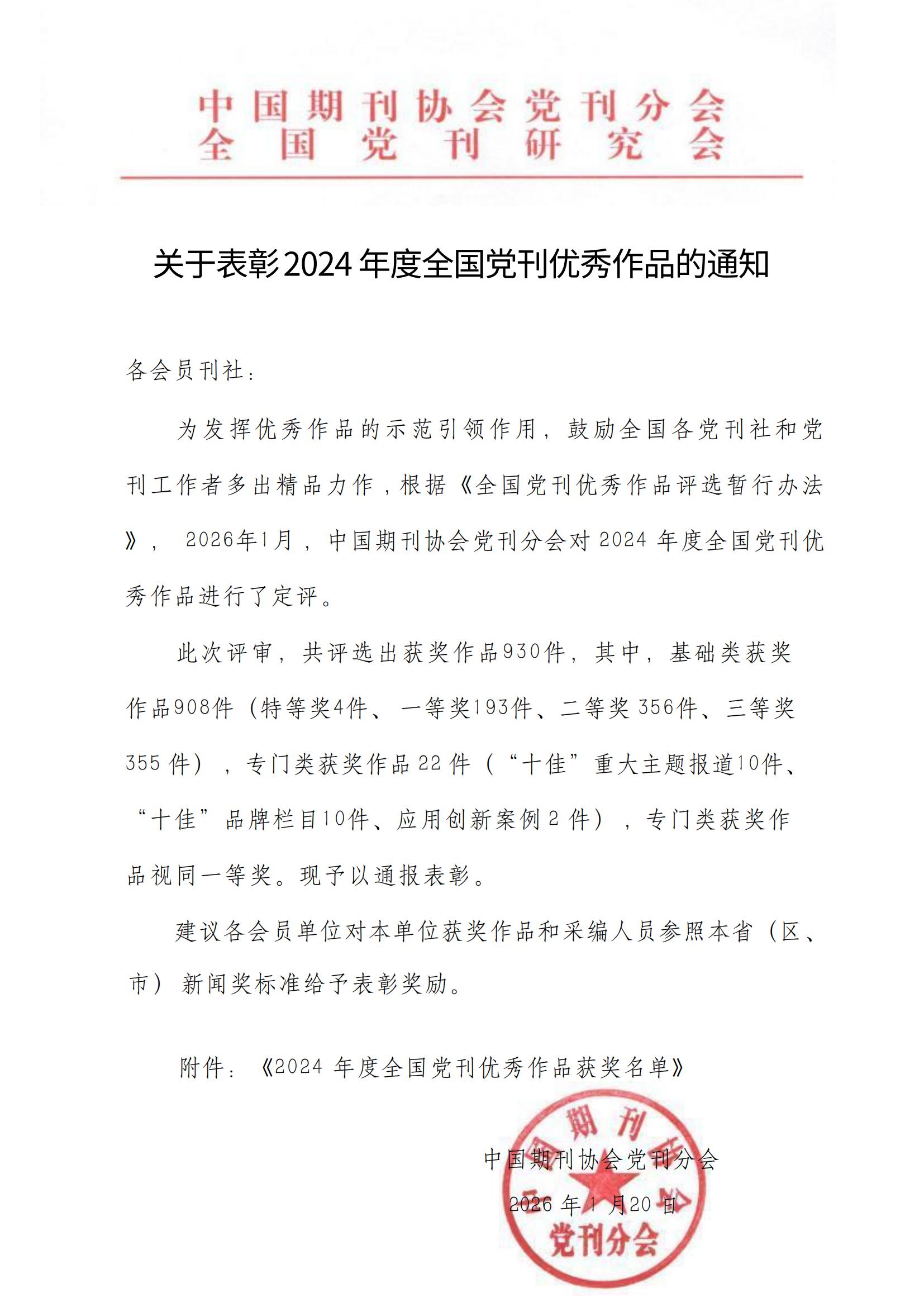 為發(fā)揮優(yōu)秀作品的示范引領(lǐng)作用,鼓勵全國各黨刊社和黨刊工作者多出精品力作,根據(jù)《全國黨刊優(yōu)秀作品評選暫行辦法》,2026年1月,中國期刊協(xié)會黨刊分會對2024 年度全國黨刊優(yōu)秀作品進行了評審。