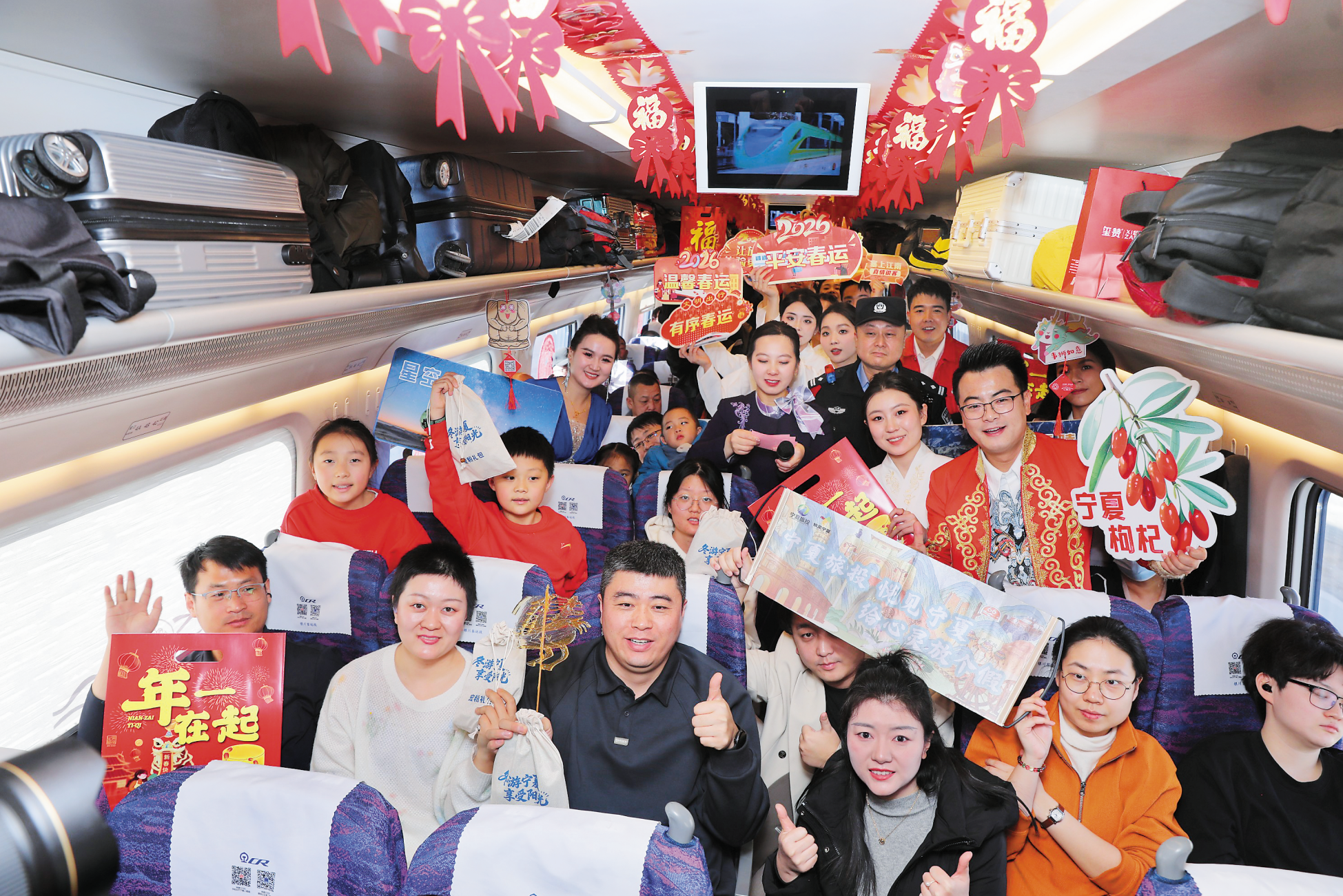2月10日,飛馳在包銀高鐵上的列車化身移動(dòng)的文旅長(zhǎng)廊,旅客跟著高鐵游寧夏,感受塞上江南的文化底蘊(yùn)與新春氛圍。 自治區(qū)文化和旅游廳供圖
