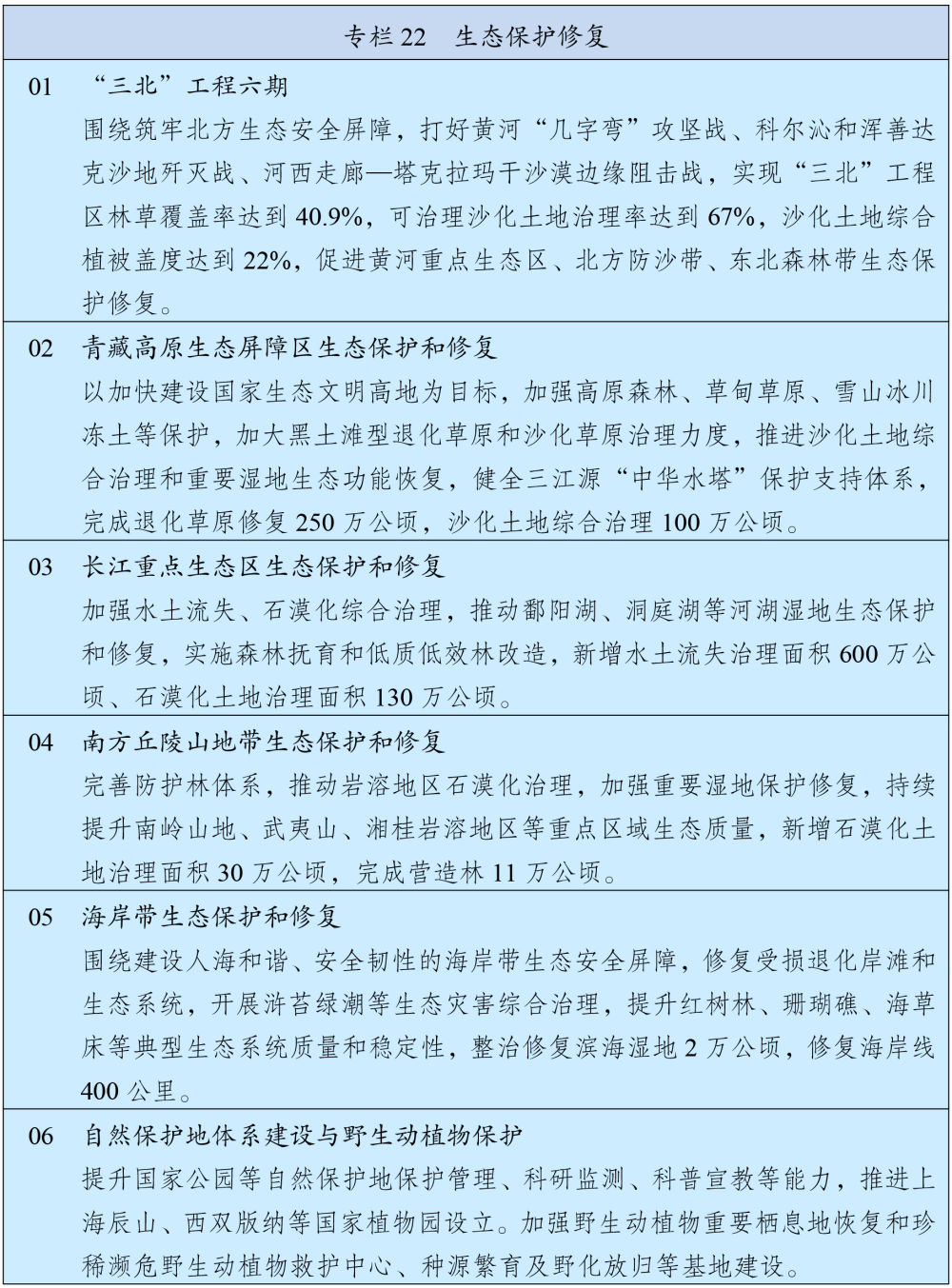 統(tǒng)籌推進(jìn)重要生態(tài)系統(tǒng)保護(hù)和修復(fù)重大工程,持續(xù)鞏固以“三區(qū)四帶”為骨架的國家生態(tài)安全屏障體系。打好“三北”工程攻堅戰(zhàn),推動三大標(biāo)志性戰(zhàn)役取得決定性勝利。深入推進(jìn)青藏高原生態(tài)保護(hù),加強重點區(qū)域水土流失治理和石漠化治理??茖W(xué)開展大規(guī)模國土綠化行動,推進(jìn)森林質(zhì)量精準(zhǔn)提升和國家儲備林建設(shè),森林蓄積量達(dá)到224億立方米,統(tǒng)籌草原生態(tài)修復(fù)與合理利用,加強濕地保護(hù)修復(fù)。推進(jìn)超引地表水和超采地下水治理,開展歷史遺留廢棄礦山生態(tài)修復(fù)。