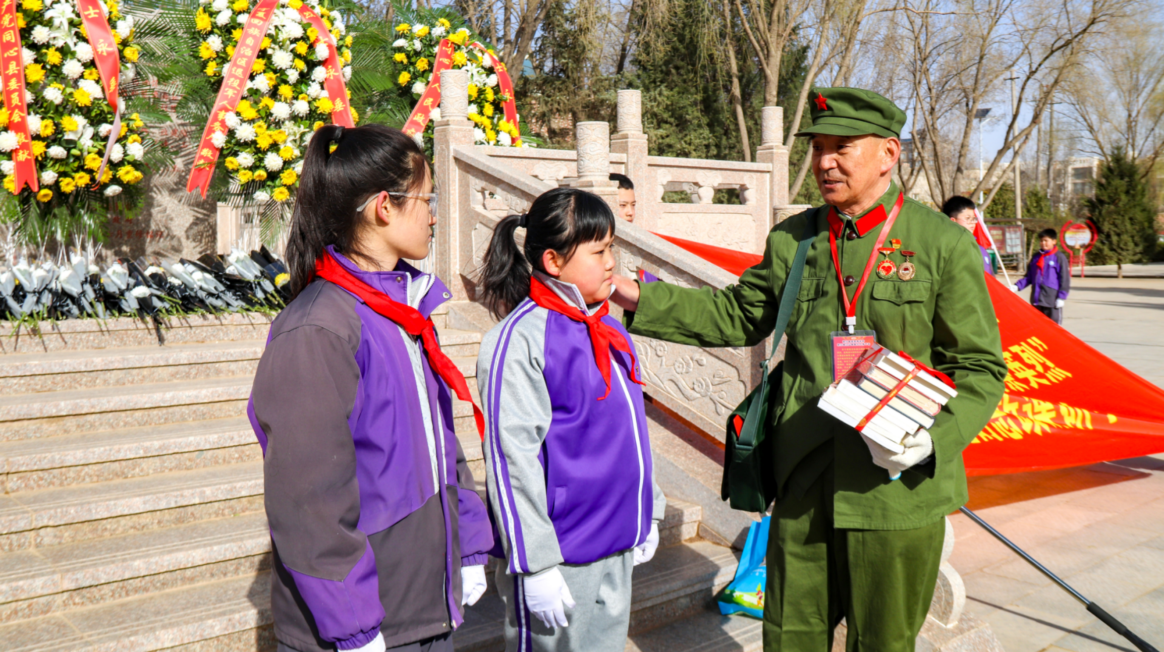 自治區(qū)退役軍人事務(wù)廳牽頭組織全區(qū)13所縣級以上烈士陵園同步開展“賡續(xù)·2025·清明祭英烈”系列活動。圖為同心縣烈士陵園活動現(xiàn)場,老兵宣講團(tuán)成員馬希偉為少先隊(duì)員講述先輩們奮勇殺敵、舍生忘死的英勇事跡。 自治區(qū)退役軍人事務(wù)廳供圖